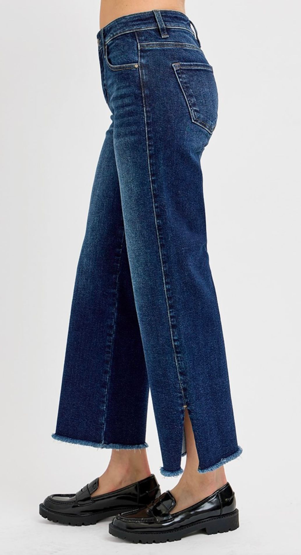 Dark wash jean with a side slit giving this jean more movement and versatility. Raw hem detail making it easy to transition for any occasion.