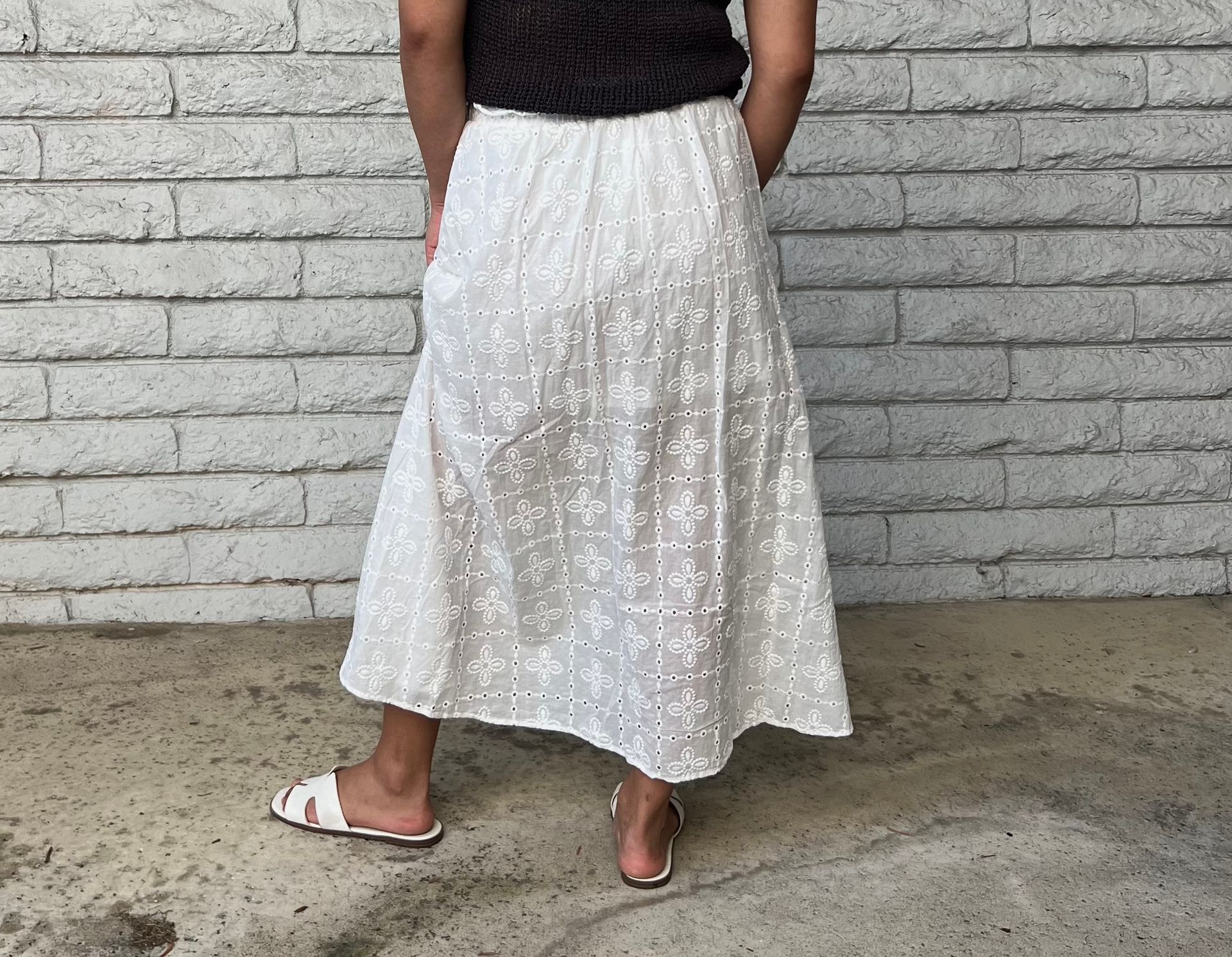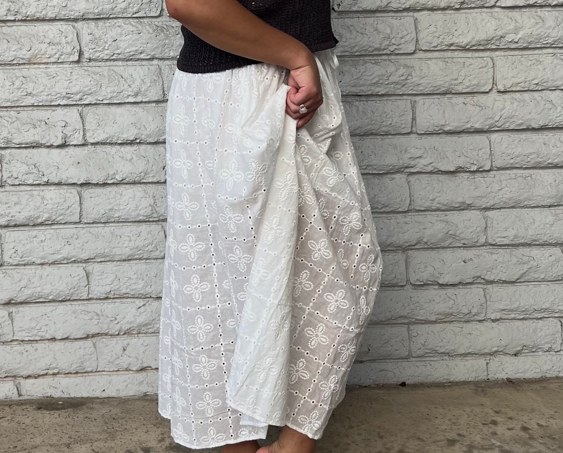 White lined skirt with beautiful eyelet detail to add a more elevated look. Has an elastic waistband. Add a chunky sweater or a basic top.