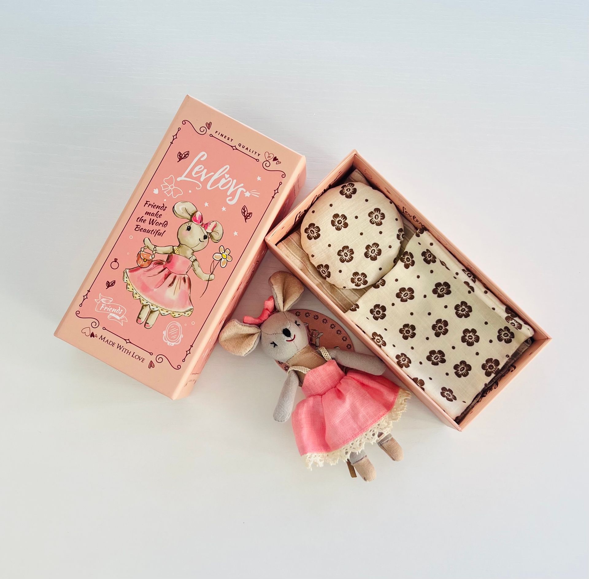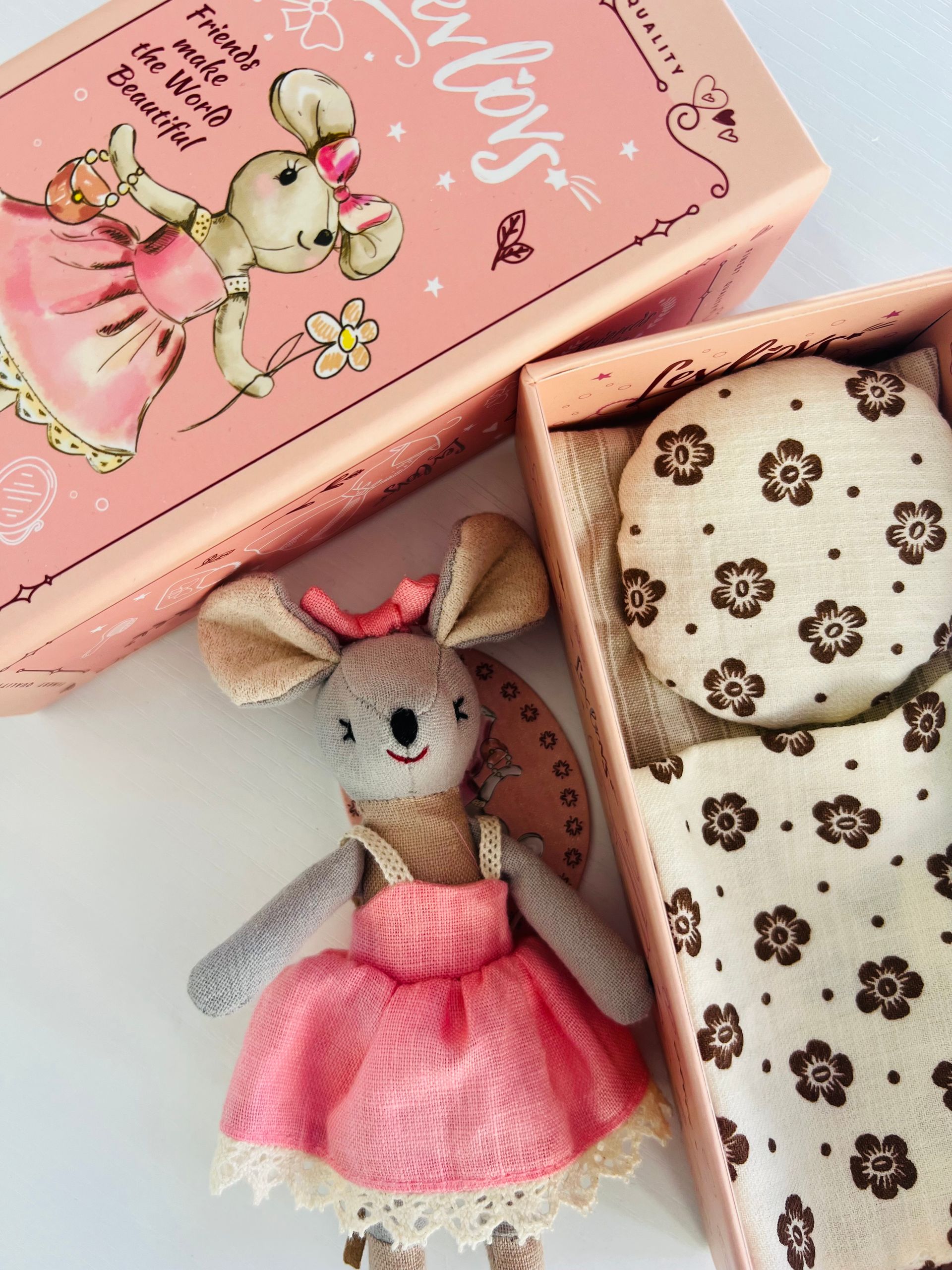 Lili mouse made from soft cotton fabric wears a pink dress with a whimsical look.