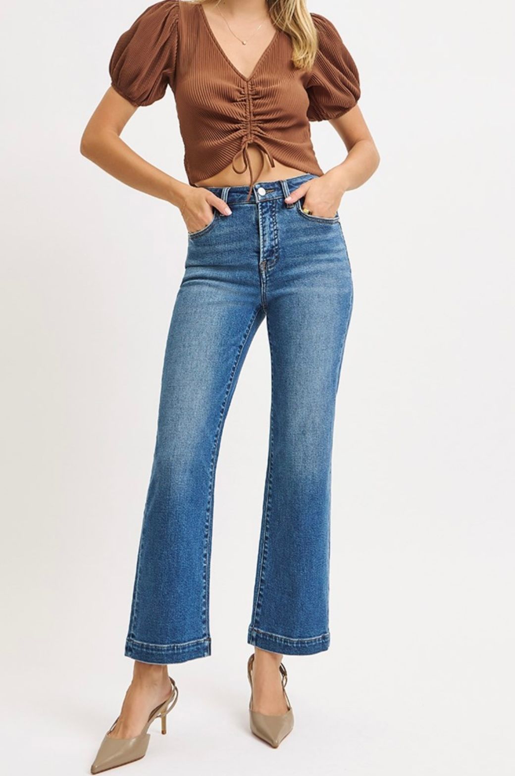 Medium wash crop style jean. Denim with stretch and won't cut into you when wearing. great everyday denim.